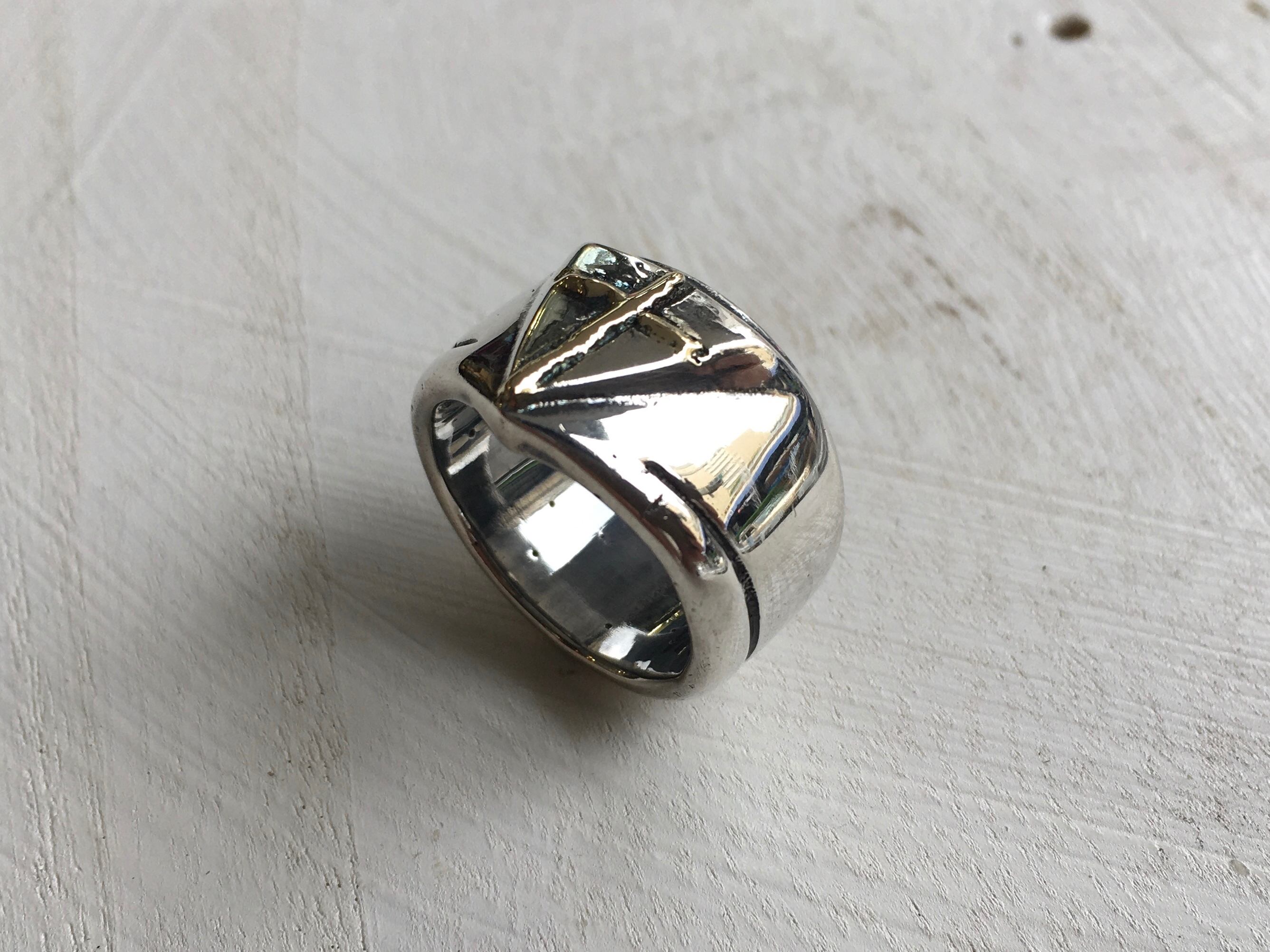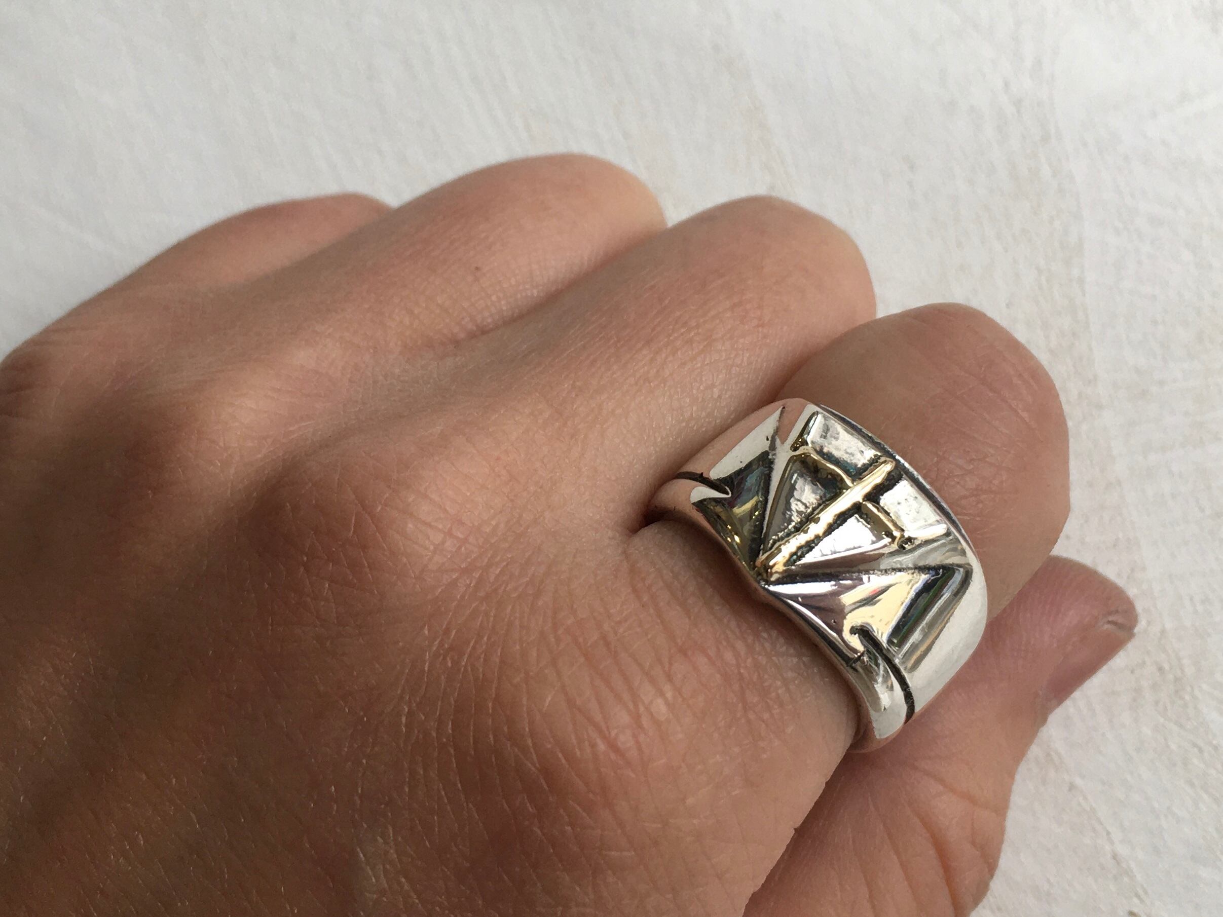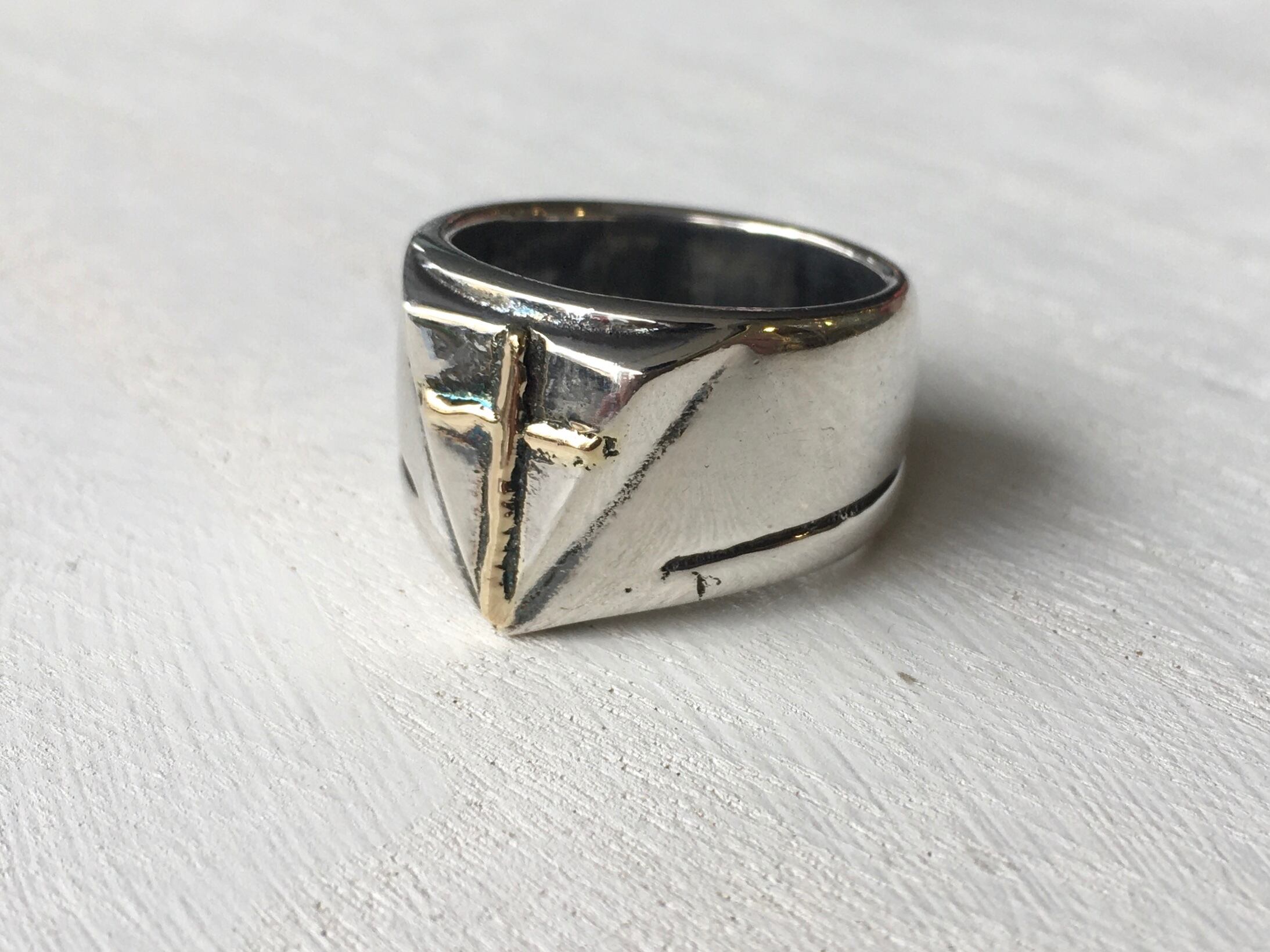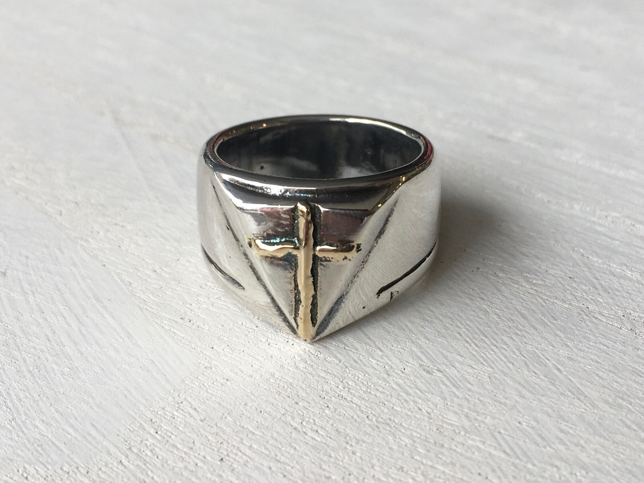 ボリュームがありながらもスッキリとしたデザインのリングです。そこにゴールドのクロスをはめ込み一体感を持たせてます。心に何かを誓いたい時に。