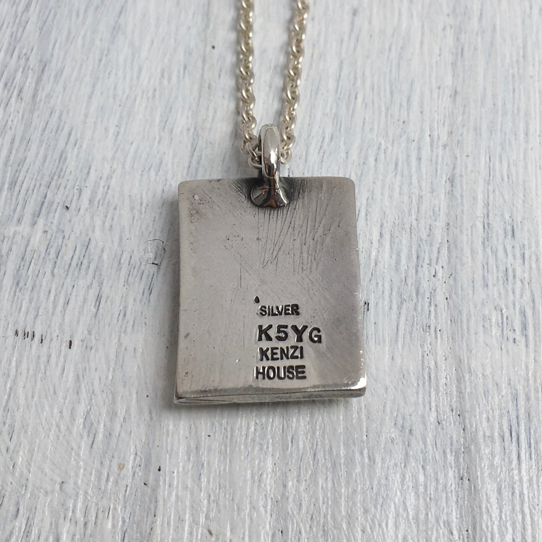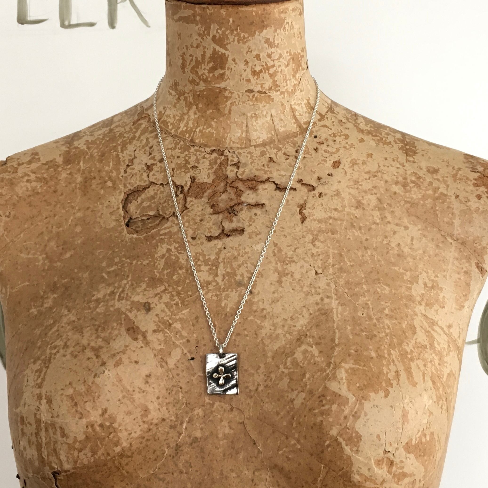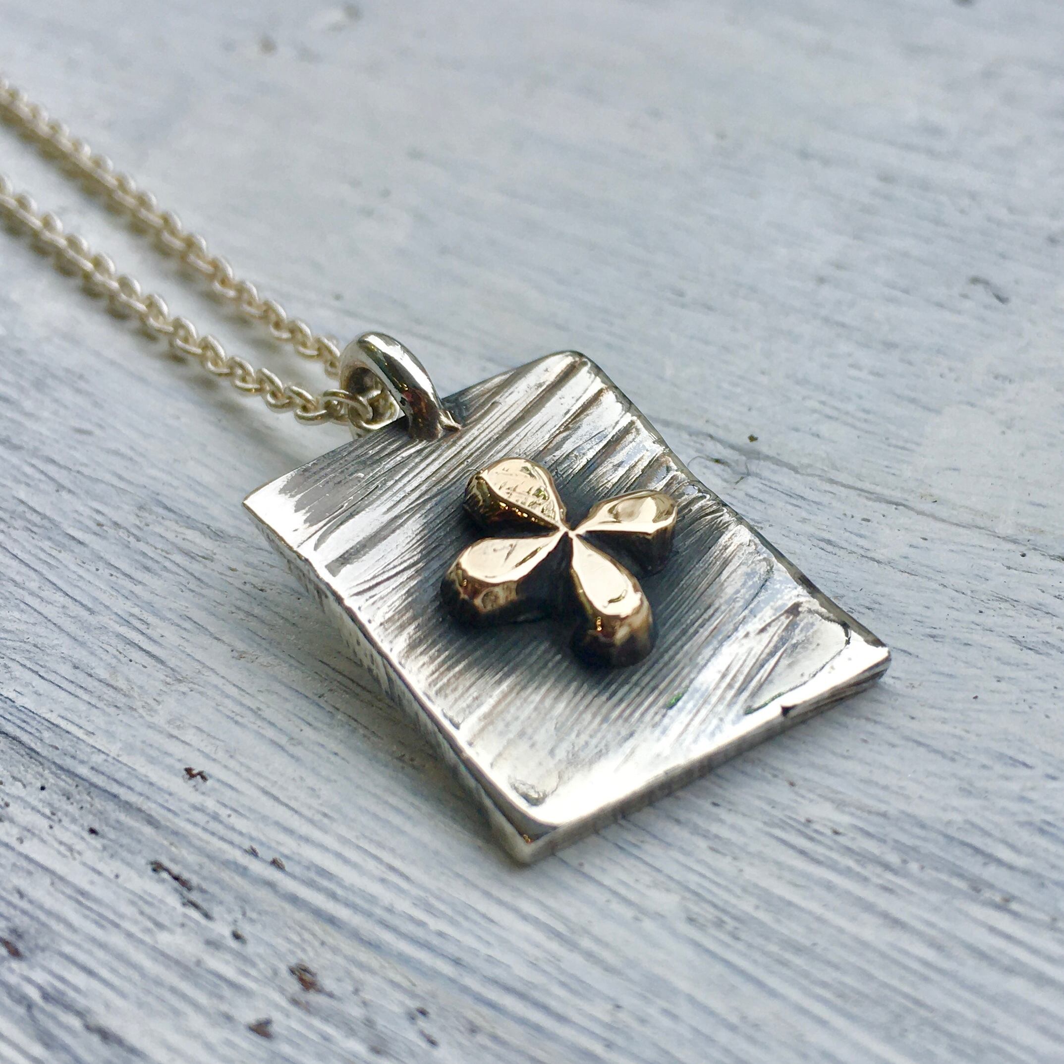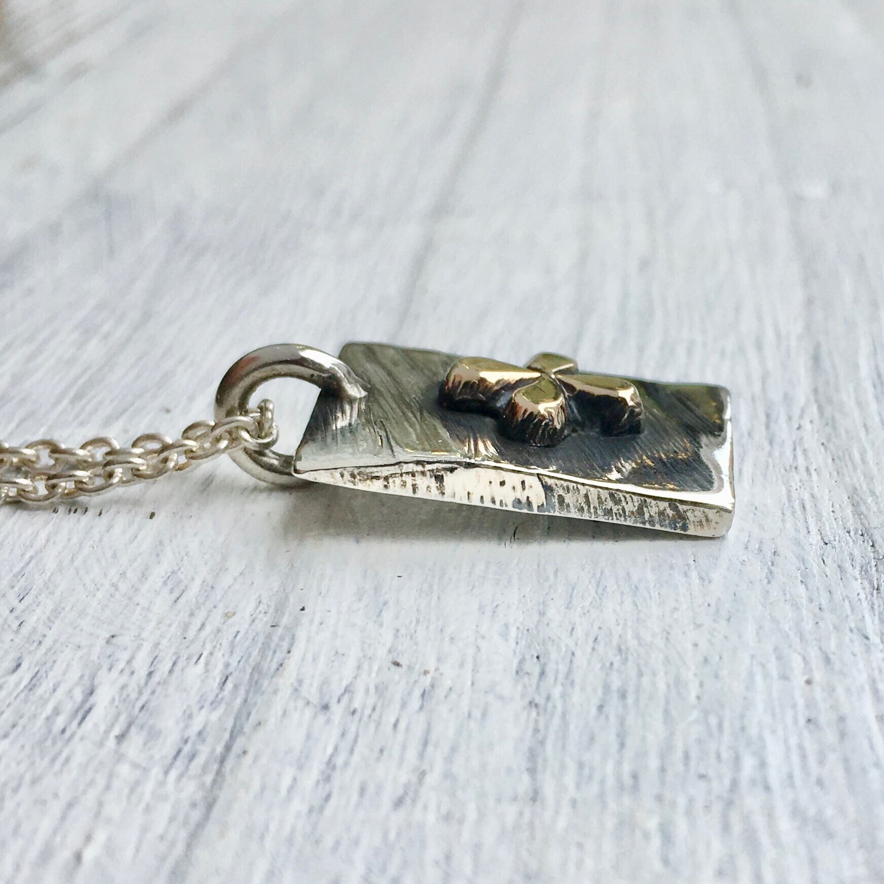 切り出したラフなシルバーのプレートに花のような十字架をゴールドであしらったペンダントになります。