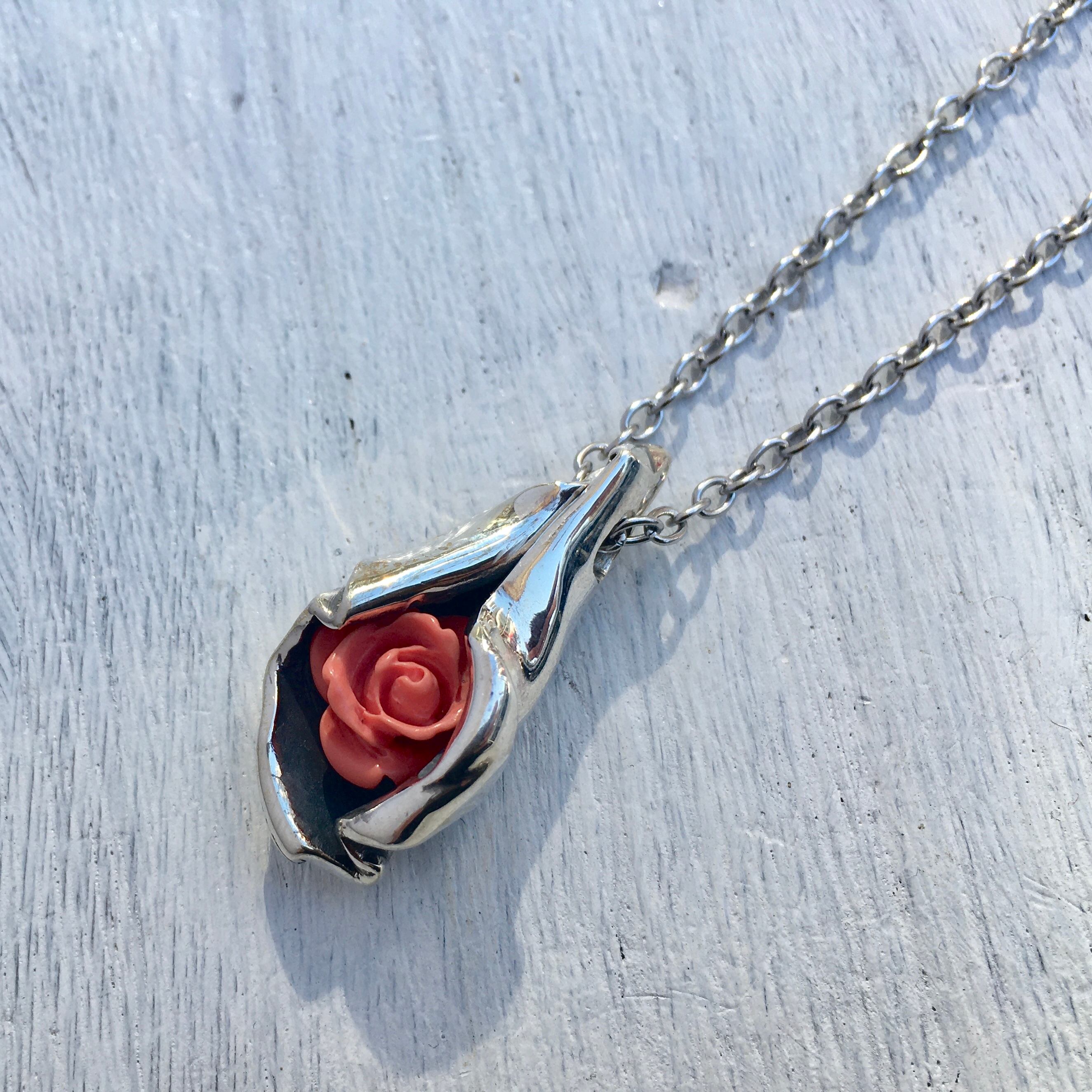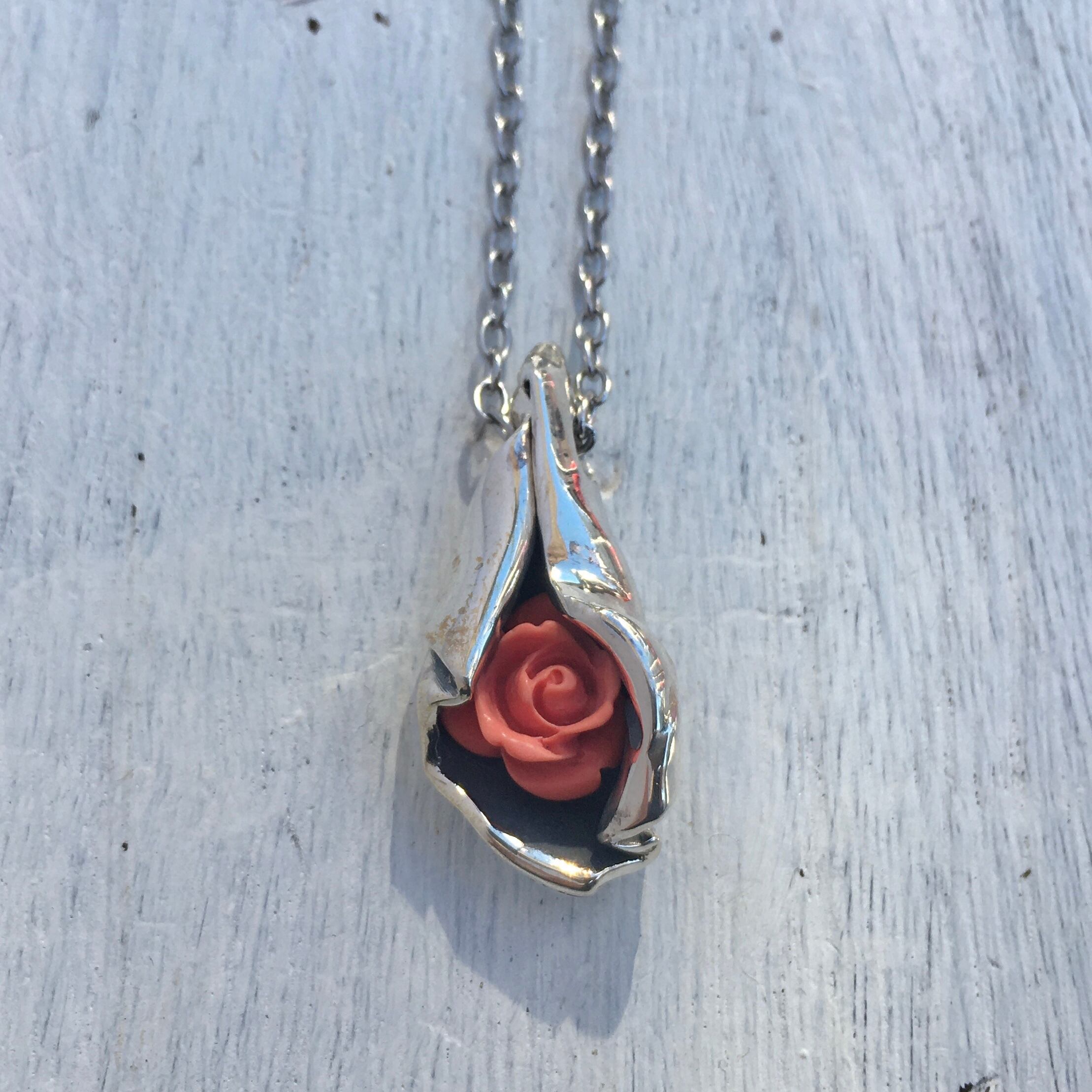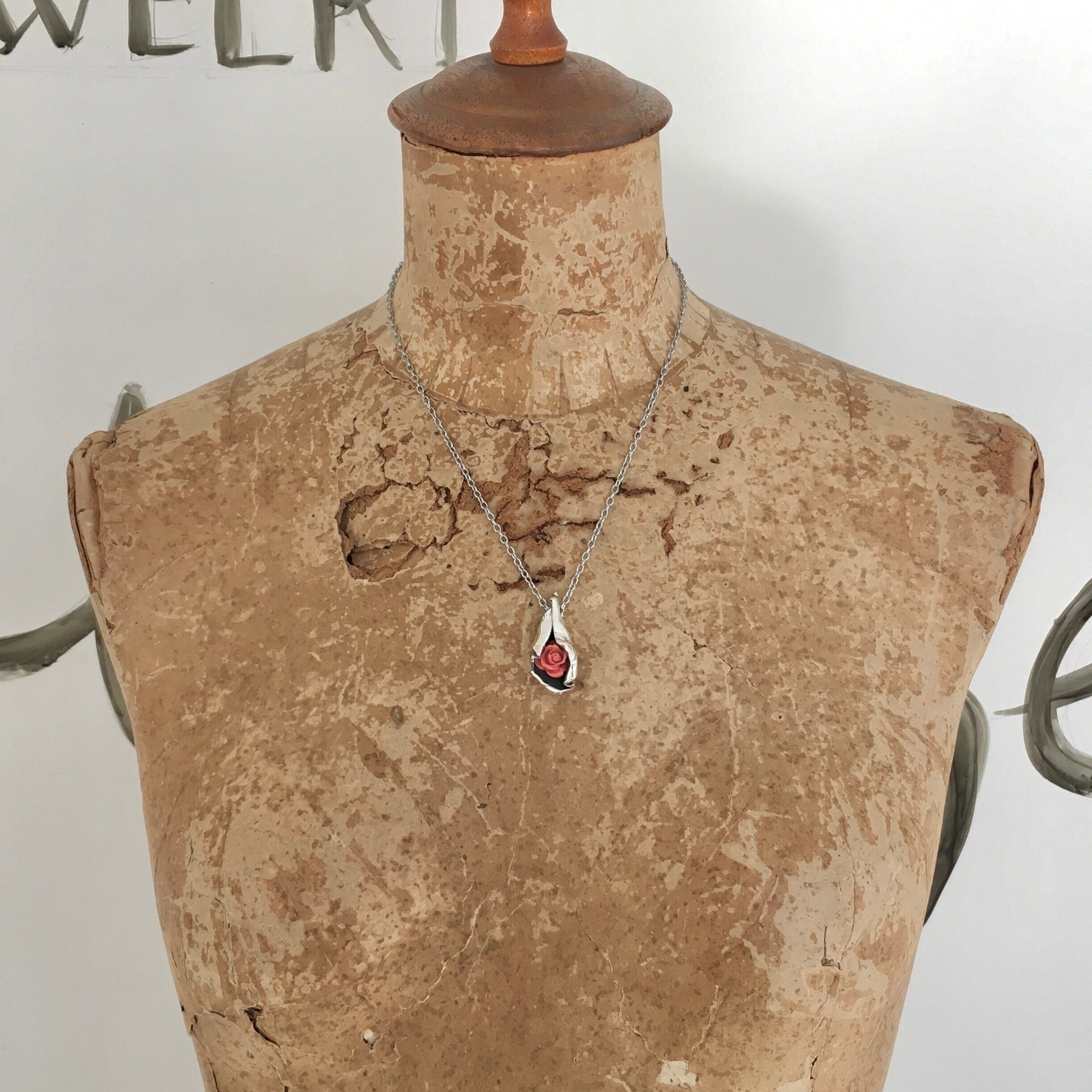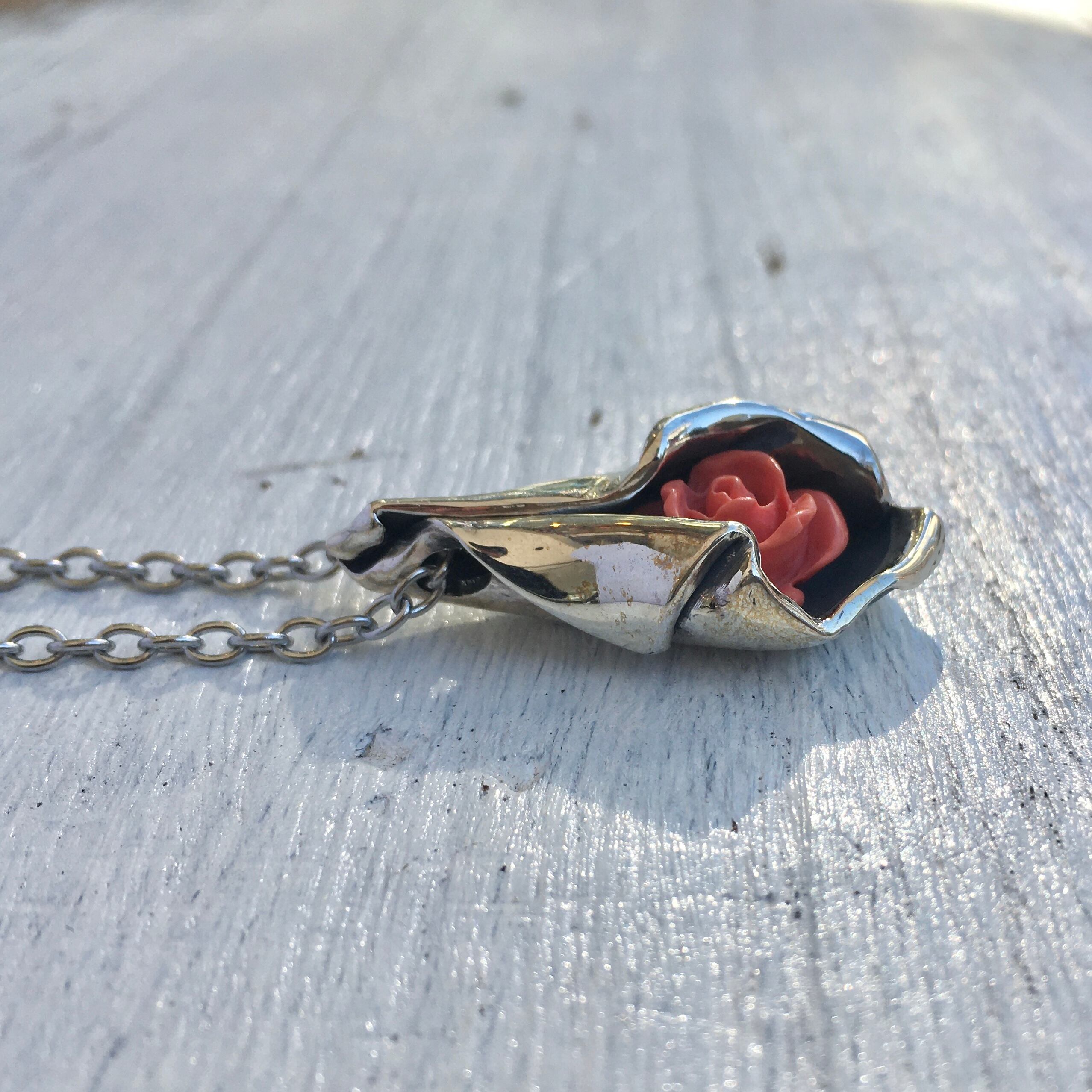 シルバーの包みの中にちらりと覗くバラが愛らしい一点物のペンダントになります。
